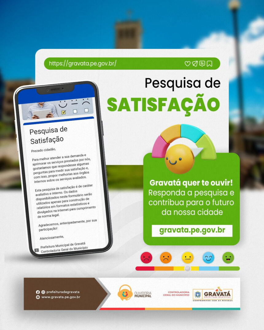 A população de Gravatá tem até 30 de maio para participar de uma pesquisa de satisfação disponível no site da Prefeitura. A iniciativa, exigida pelo TCE-PE através do Programa Nacional de Transparência Pública da ATRICON, é conduzida pela Controladoria Geral do Município em parceria com as secretarias de Ciência, Tecnologia e Inovação, e Comunicação. O objetivo é coletar opiniões dos moradores para compor o Relatório da Pesquisa de Satisfação de 2025, que visa melhorar os serviços oferecidos pela gestão municipal. A pesquisa pode ser acessada pelo site gravata.pe.gov.br ou diretamente pelo link abaixo: